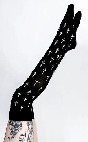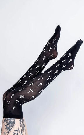 Indulge in your dark side with our Praise Satan Thigh High Stockings. These sultry stockings feature inverted crosses running all along their length, these sheer stockings will command attention wherever you go.