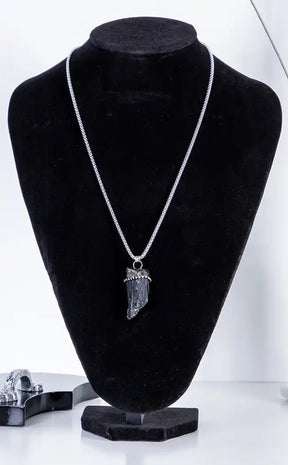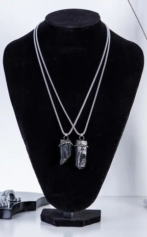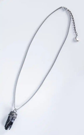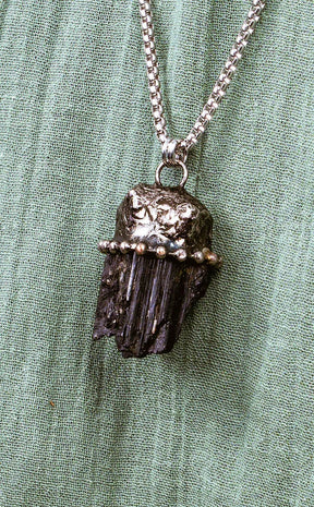 The Protection Spell Black Tourmaline Necklace is made from a raw natural dark black tourmaline crystal that has been encased in a handmade sculptured solder setting, hanging from a stainless steel box chain which is adjustable between approximately 60-68cm long, with a lobster clasp and a crescent moon charm. These necklaces are hand made and each is beautifully unique.