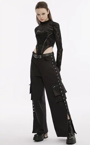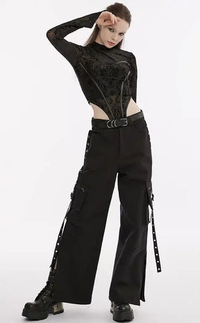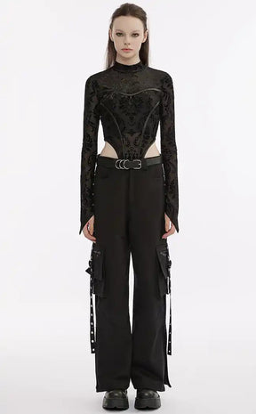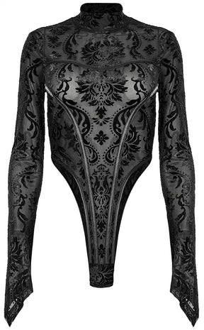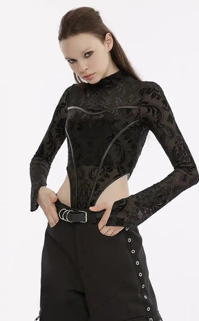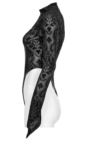 The pattern is a beautiful dark flocked damask in gothic floral. It has faux leather straps across the front to create a streamlined flattering shape and a futuristic vibe.