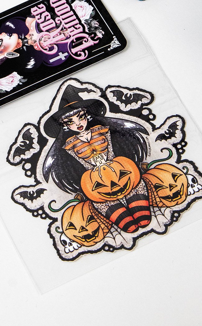 Add some pumpkin spice to yer life with this sexy witch! Stick her to your books, laptop, phone or anywhere that needs a touch of spooky charm.
