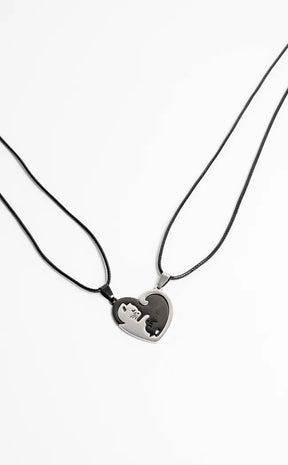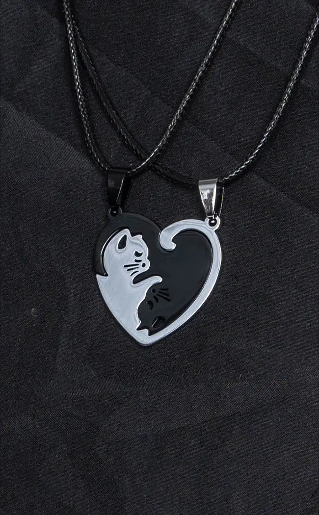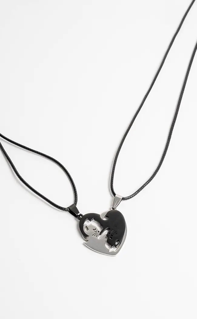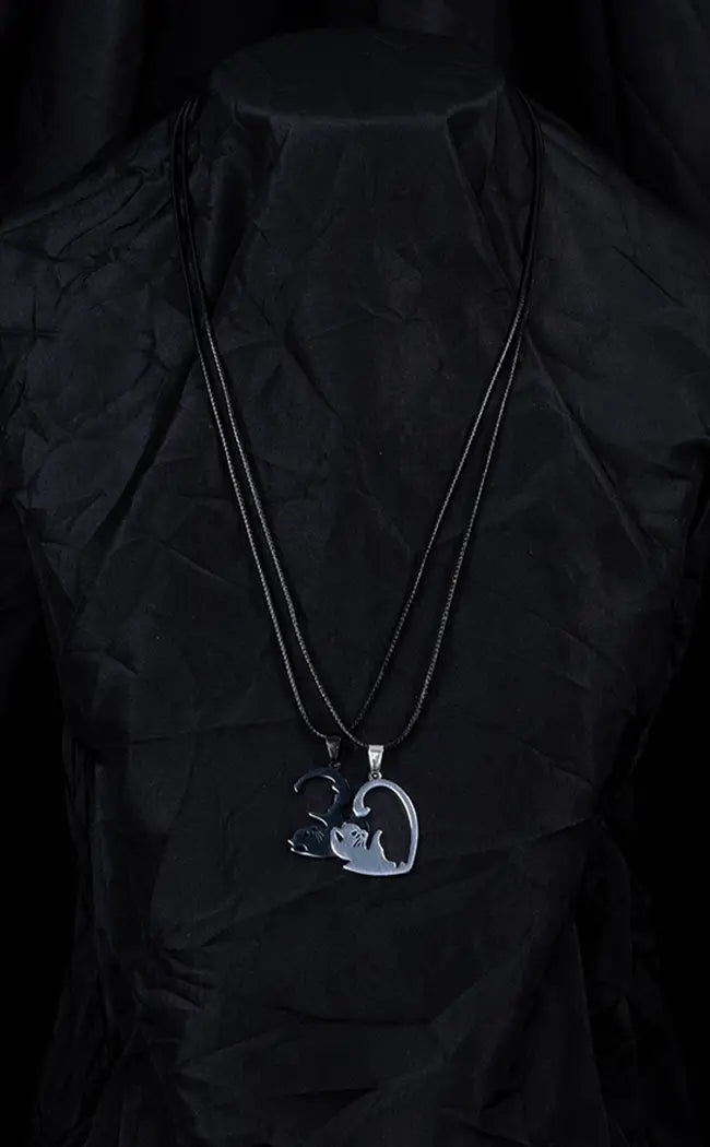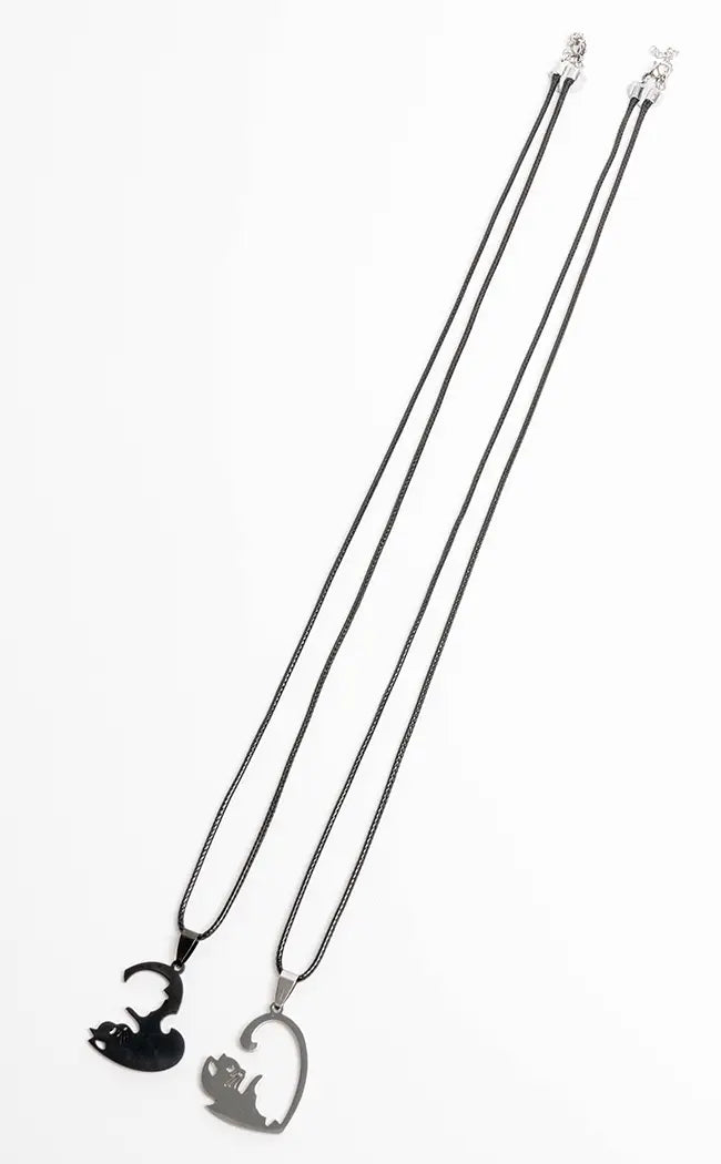 Each necklace has a pendant featuring half of a cat symbol in silver and black, which comes together like a puzzle piece. This necklace makes the perfect gift.