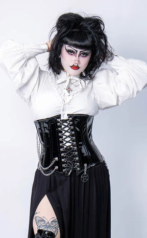 Exert your influence over the thirsty masses in the Power Trip Corset! This steel boned underbust corset is made with high gloss PVC to have you feeling like the ultimate domme. Killer embellishments take everything to the next level, including chains, a pentagram charm and a front lace-up panel. The back of the corset comes with a modesty panel behind the lacing that can be folded away according to your wear preference.