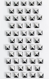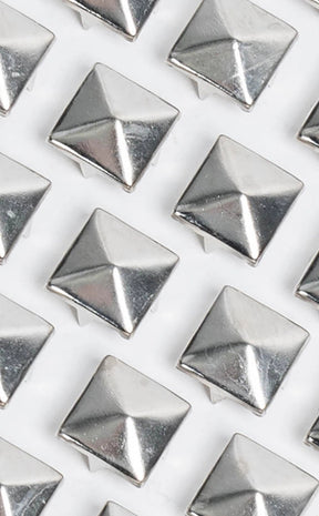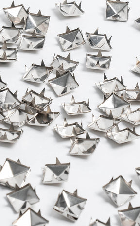 Our pyramid studs are made of iron and feature four prongs for extra hold and are lightweight so they won't weigh you down. They are super easy to apply, just poke through and fold the prongs over the fabric.