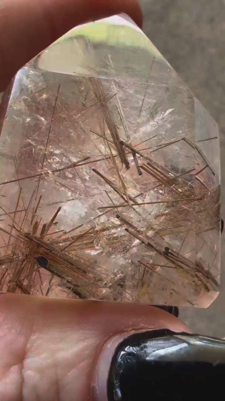 These towers are beautiful. All have dark red and spiky gold needles inside very clear quartz. You can see the gold & copper shimmer in the sun. Last picture shows which tower is which.