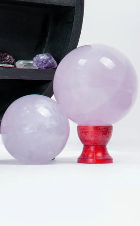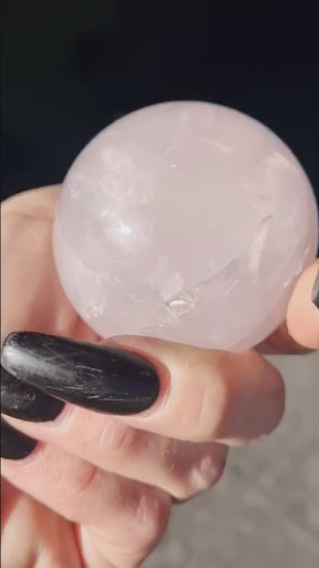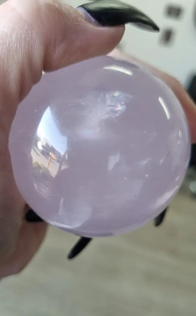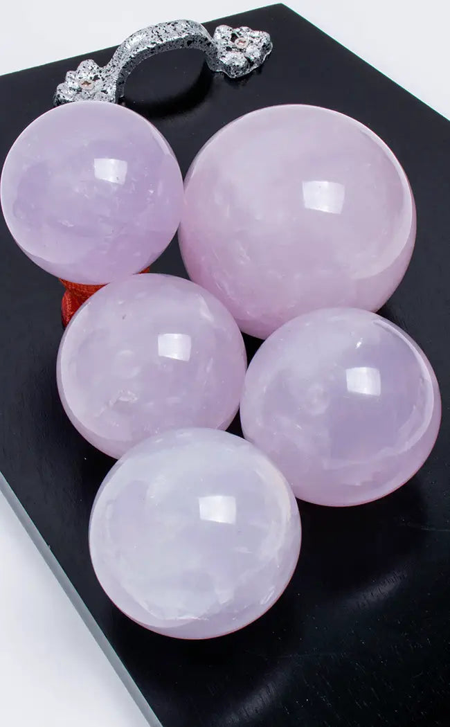 Lavender Rose Quartz is a rare variety of Rose Quartz that has a purple-ish hue due to the presence of higher concentrations of manganese and/or titanium. This lavender hued rose quartz has been polished into gemmy spheres - full of rainbows and lots of light refraction.
