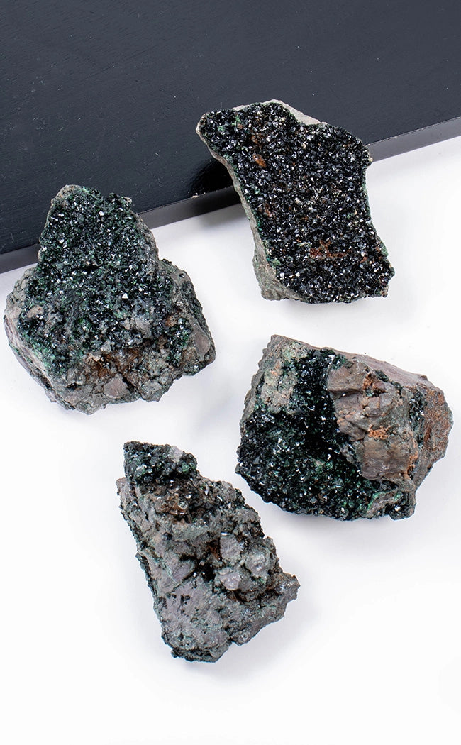 These clusters are stunning with beautiful sparkly black / dark green crystals. Libethenite is a scarce Copper Phosphate hydroxide mineral. It appears as striking, dark green, almost black orthorhombic crystals.