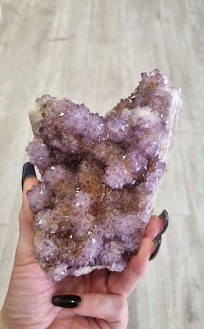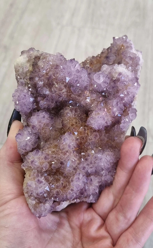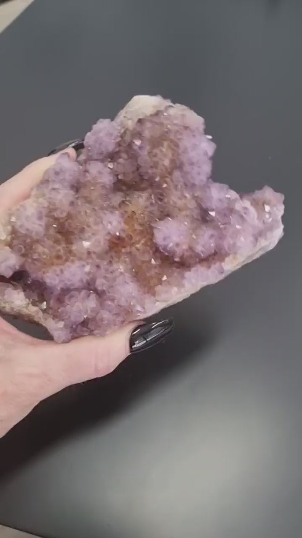 This piece is absolutely stunning! A huge cluster of Amethyst with Citrine in spirit quartz (also known as cactus or fairy quartz) formation. This is such a rare find at 1.3kg! It has gorgeous sparkling encrustations of crystals all over it on both sides - your biggest dilemma is going to be which side to display! A quality specimen from South Africa, this piece would be a stunning centrepiece in any collection. It is unusual to get spirit quartz this large as it's often broken in the act of mining. But we were lucky enough to get hold of this piece.
