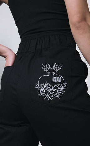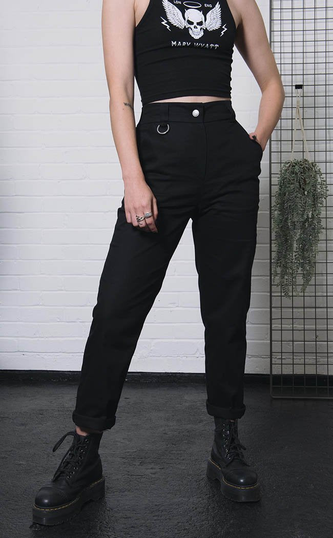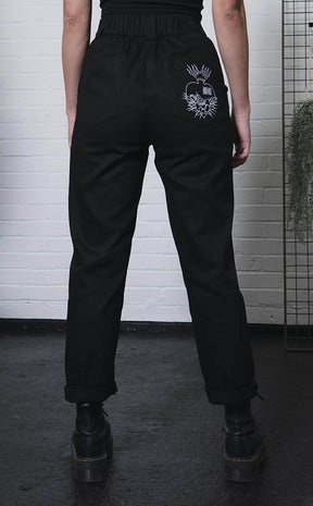 Meet your new fave pants! With a stretchy waistband these babies may feel casual but the sleek yet hardy drill fabric and O ring mean you can dress up and down as you like! The back pocket also features Mary Wyatt's signature heart embroidered in white as a touch of drama
