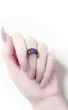 A Magical 18 Karat Black Gold-plated Sterling Silver Moon Ring with a Tanzanite Cubic Zirconia gemstone.