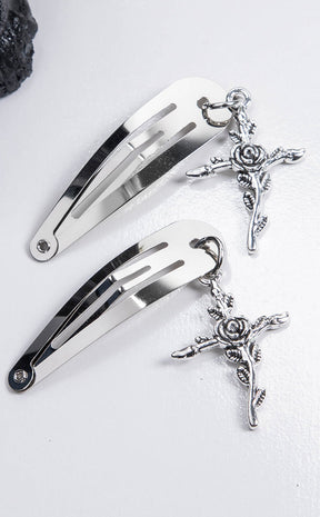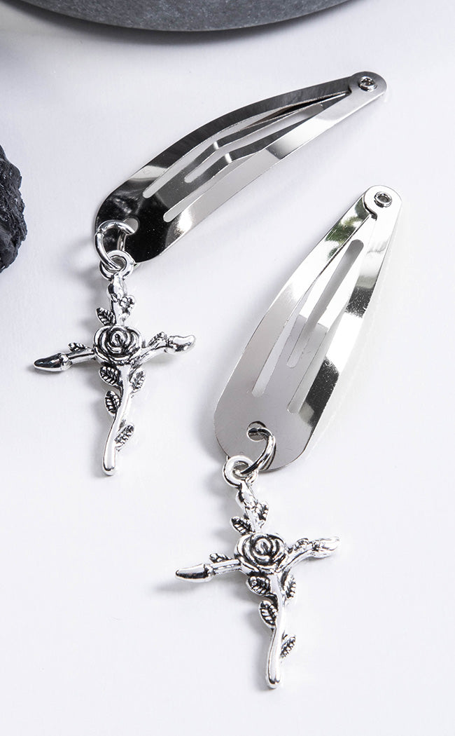 Dress to distress with the Rosenkreuz Hair Clips! These cute clips feature hanging cross charms decorated with winding roses. Add as the finishing touch to your updo or simply keep your flyaways at bay.