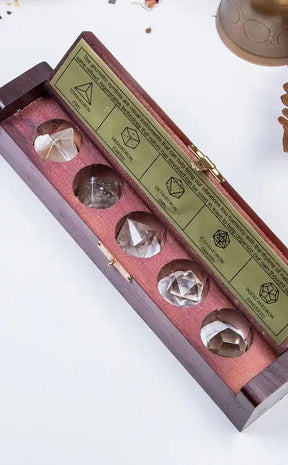 This set of 5 crystals are carved into prisms relating to the elements water, earth, the universe and air as well as the star tetrahedron.