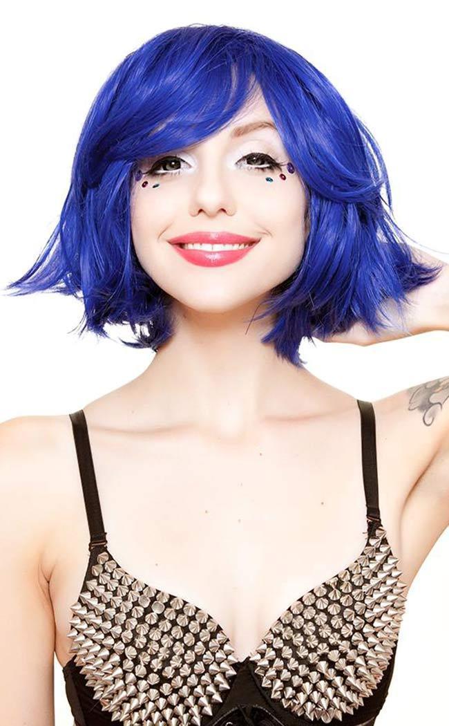 Vivid royal blue short wig with super flirty layers. Can be styled messy or straightened into a tidy bob.