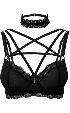 Sink your teeth into the bloody gorgeous She Bites bra! Stretchy and soft to worship yer bod, this bra is trimmed with luxury lace and features statement pentagram straps across the chest. A ribbon and cross charm adds a sweet touch at the chest.