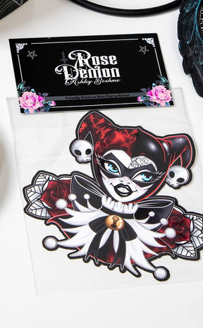 Take yer favourite Harley out for a spin! This gorgeous trickster is back with an extra spooky flair. Stick her to your books, laptop, phone or anywhere that needs a touch of punk jester madness!