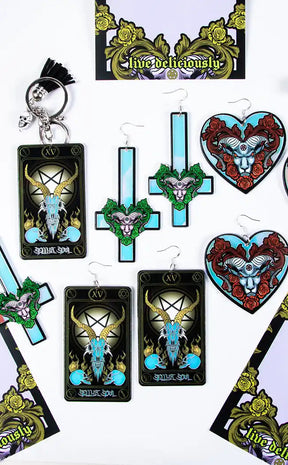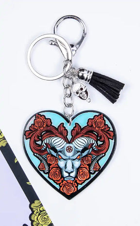 She's The Devil Holographic Keychain shows your allegiance with a goats head in an intricate frame of roses on a silver holographic background. Finished off with a skull charm and black tassel.