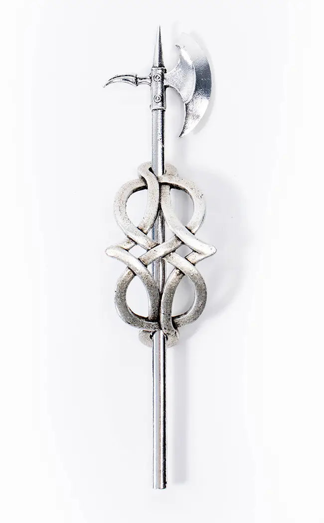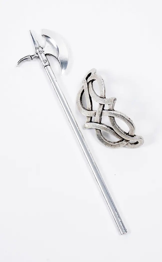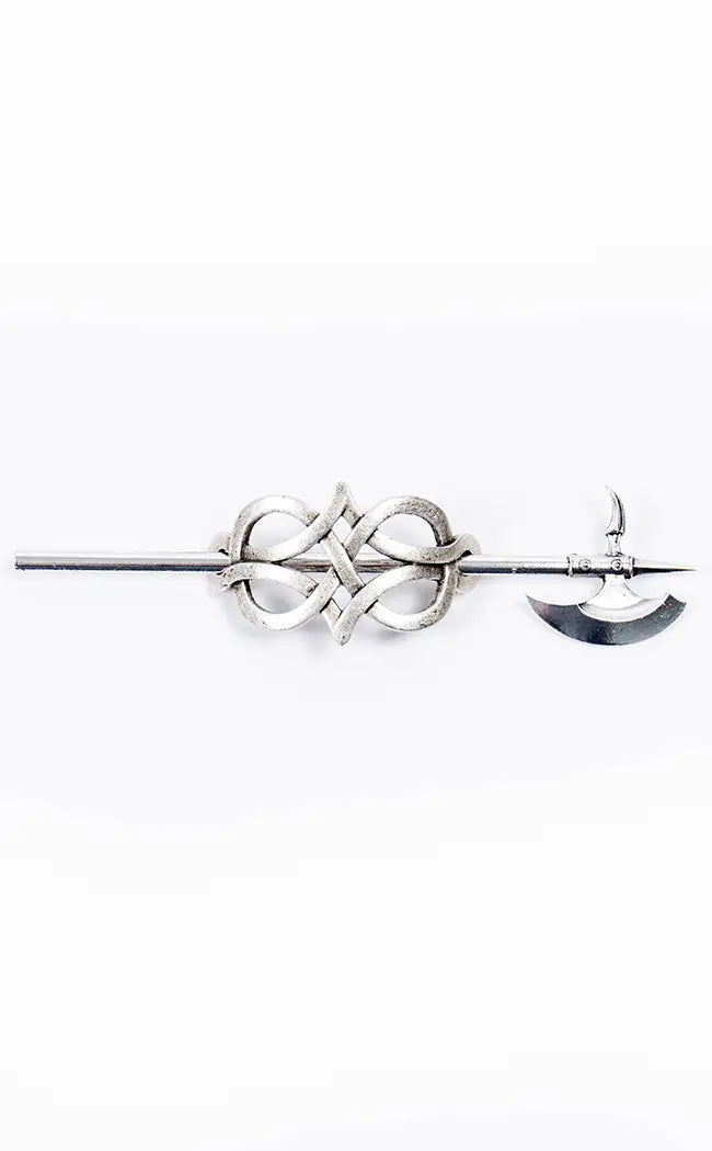 This incredible hair stick features an intricately designed axe shape with a shield that extends through the base.
