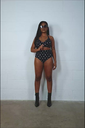 Get soaked to yer skin n bones in the Skull 2-Piece Swimsuit! This 2 piece features a high waisted bottom and a lightly padded top with an underwire for extra support. The super-soft stretch nylon fabric is covered in spooky skulls and forms a halter neck that secures with a tie while the back secures with a snap.