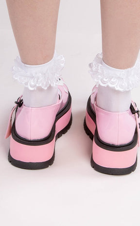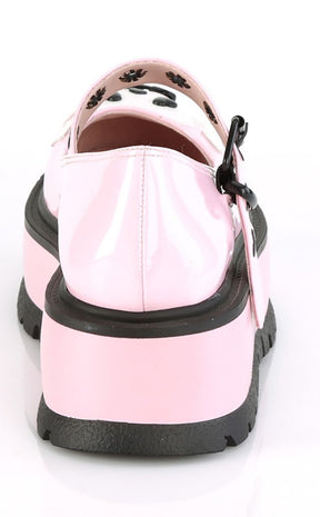 Emo forever! The awesome SLACKER-27 flatform Mary Janes feature a cute skull design on the toes, complemented by heart eyelets and black trims on pink holo vinyl.