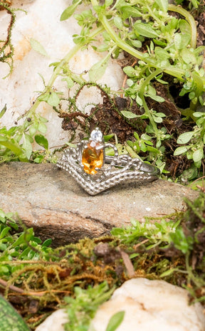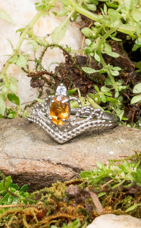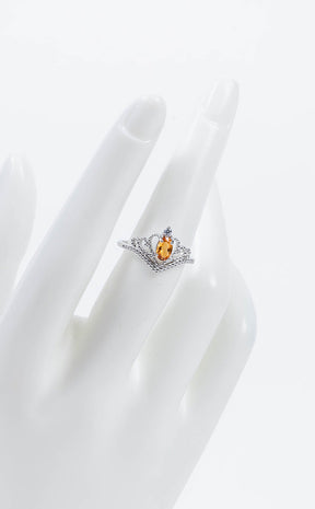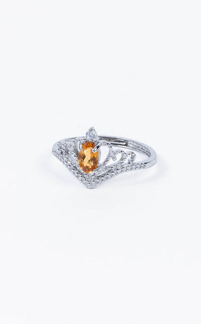 The Sol Regalis Silver Citrine Crown Ring is crafted from sterling silver and is adjustable with the Citrine stone measuring roughly at 0.5cm.