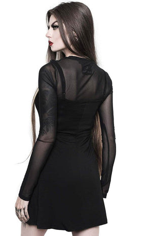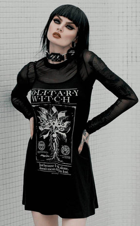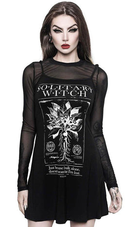 Get yer lone wold witch on with the Solitary 2 Piece Dress! A super-stretch slip dress sits over a separate mesh long-sleeved top, inviting you into a whole new world of match up opportunities! The dress features thin shoulder straps and a white-on-black print take makes a gorgeous statement in a flash.