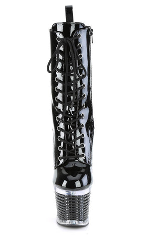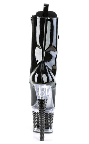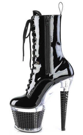 You're a one-woman show, baby! The SPECTATOR-1040 ankle boots feature a vegan black matte upper that secure with a lace-up and side zip. The heel and platform are topped by a clear panel above a 3D stud look wrapping.
