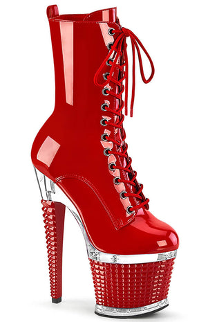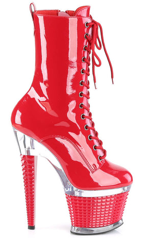You're a one-woman show, baby! The SPECTATOR-1040 ankle boots feature a vegan red patent upper that secure with a lace-up and side zip. The heel and platform are topped by a clear panel above a 3D stud look wrapping.