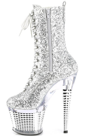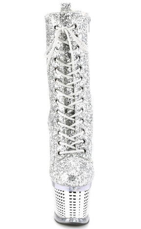 You're a one-woman show, baby! The SPECTATOR-1040G ankle boots feature a vegan silver glitter upper that secure with a lace-up and side zip. The heel and platform are topped by a clear panel above a 3D stud look wrapping.