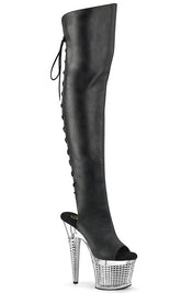 You're a one-person show, baby! The SPECTATOR-3019 thigh-highs feature a vegan black leather upper with an ankle cutout and peep toe. The boots secure with an inner zip and a rear lace up. The heel and platform are topped by a clear panel above a 3D stud look wrapping.