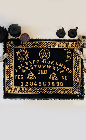 A décor piece for those who commune with spirits. A full spirit board is printed in gold over this black, rectangular cloth with a frayed border, making a beautiful spread over larger tables.