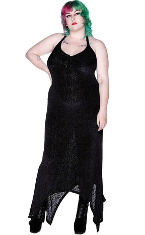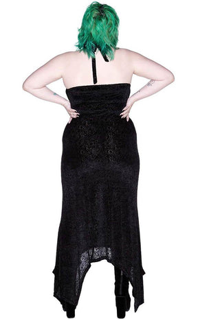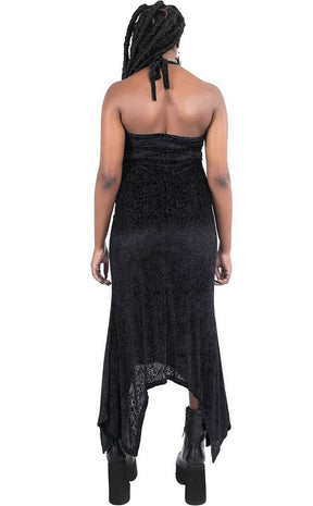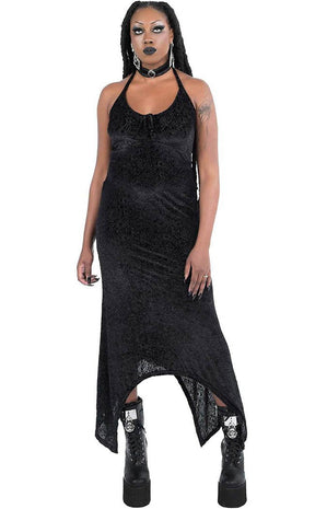This maxi is made of luxe burnout velvet, the deep neckline securing with a halter tie. The waist is fitted, the skirt trailing down the legs in tendrils of shadow, ending in a witchy hanky hem.