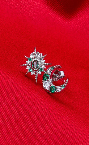 These carefully crafted sterling silver earrings are a stunning addition to any earscape. This pair features both a stunning silver & green zircon studded moon and retro starburst-style star. These earrings are gorgeous enough to be worn either separately in each ear, or both in one for an intergalactic ear curation.