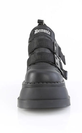 - Featuring Padded Ankle & Tongue, 'Demonia' branded Nylon Hook-N-Loop Straps w/ Metal Plate Details