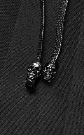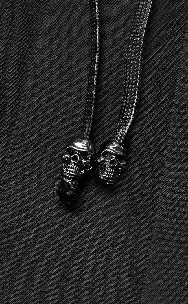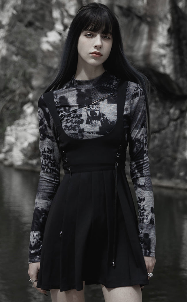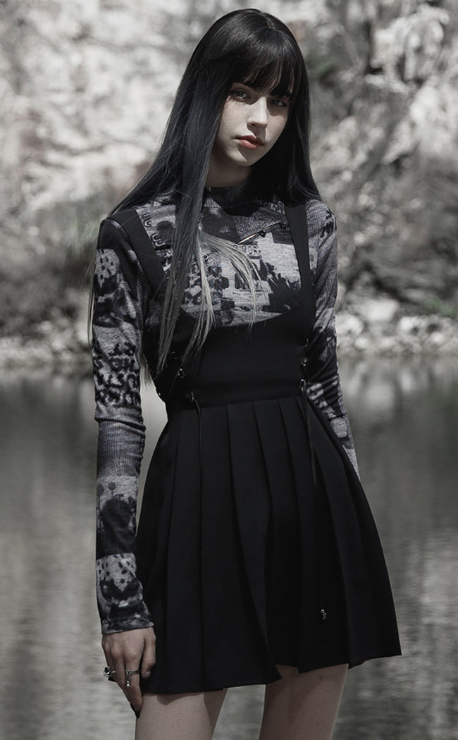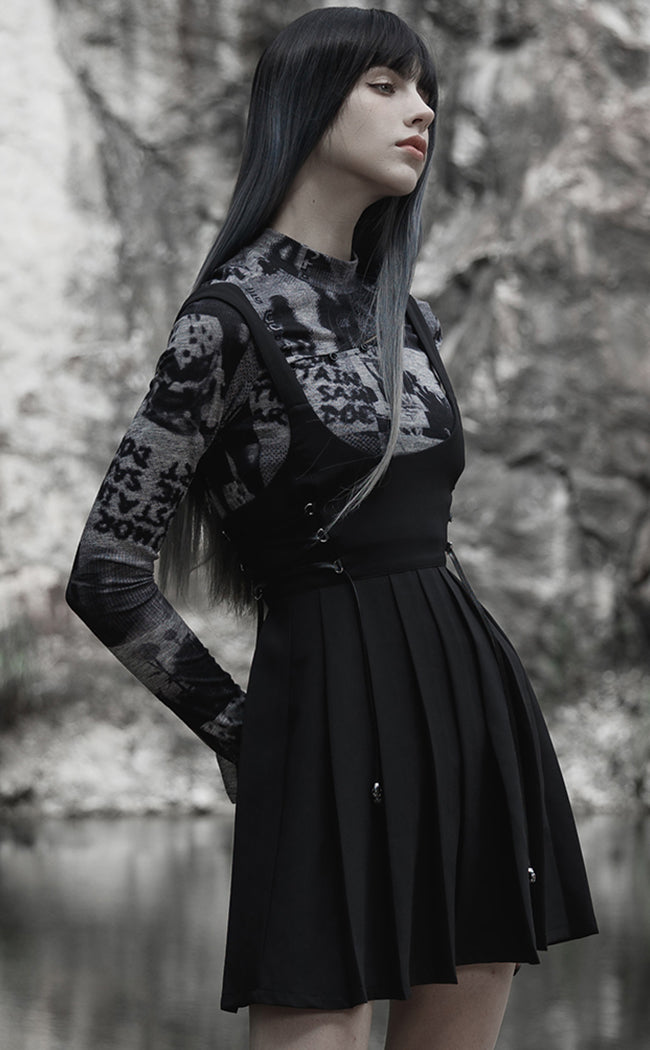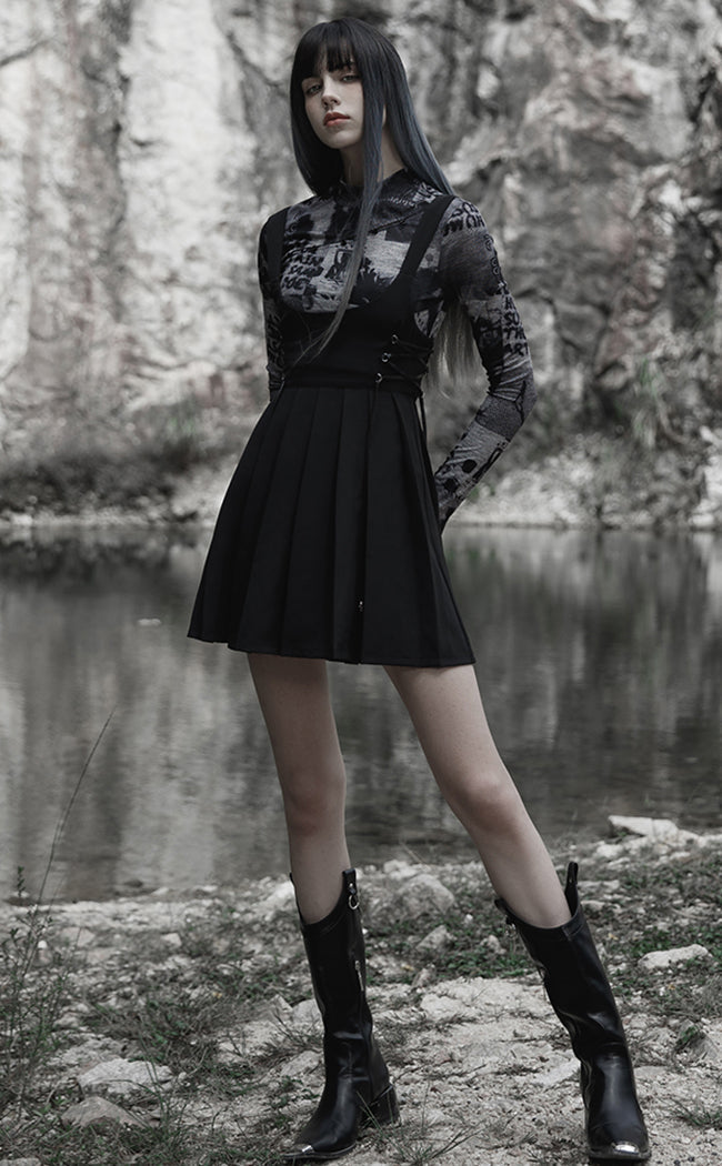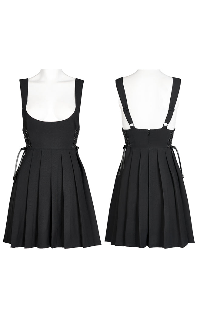 Get down with your bad self in the Stone Silence Dress! This mini dress features wide shoulder straps that frame an open chest, forming a high waist to create flattering lines. The skirt is pleated and features cute details like adjustable lace-up panels with skull charms.
