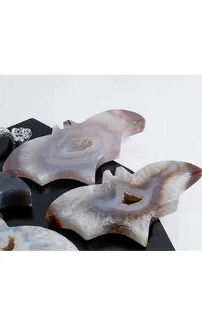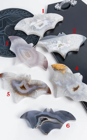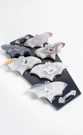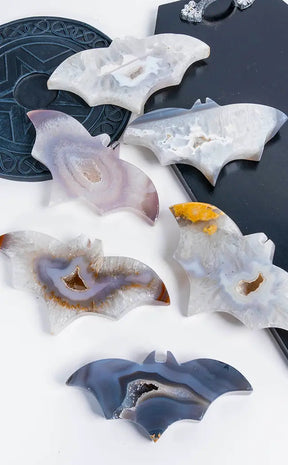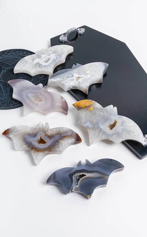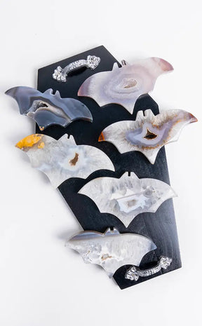 These bats are made from beautiful agate and feature stunning druzy caves in their centre. Some bats shimmer with inclusions. These bats will make a stunning piece for your home or altar.