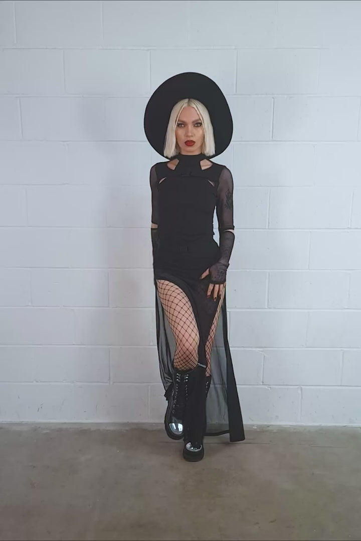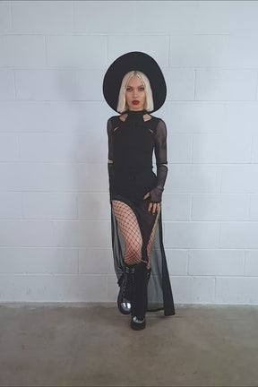 Invade their brains with the Synthia Maxi Skirt! This statement skirt features split panels of sheer mesh that float dreamily around the legs, connecting to a high-waisted modesty panty accented with a buckle belt.