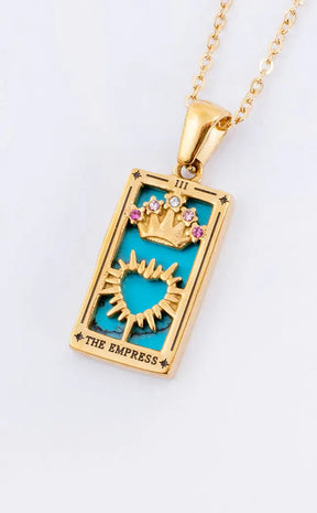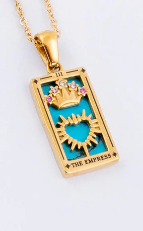 Capture the beauty of the Empress Tarot with this radiant 18K gold-plated, stainless steel necklace and let the cards be your guide.