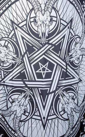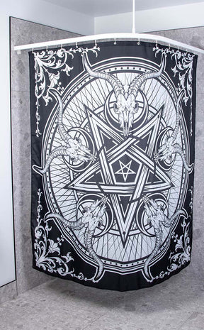 The Summoning Shower Curtain is made with soft, waterproof fabric printed with a bold contrast motif of a pentagram surrounded by goat skulls and baroque framework.