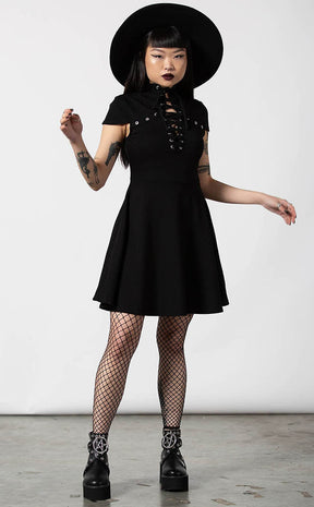 Get caught up in yer own web with the Tied Up Skater Dress. This deceptively simple dress was conjured from super soft fabric that stretches to the perfect fit. The neckline laces up, featuring a high neck, rivets and cap sleeves.
