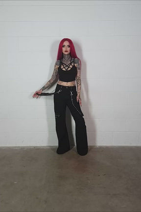 Bring out the Y2K threads in the Time Bomb Trousers! Super soft denim hugs yer bod, forming a wide waistband and a figure-hugging fit. The bottoms are flared in true throwback style and the ensemble comes complete with stud decals and detachable bondage straps.