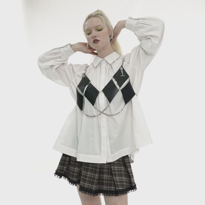 Create a wicked statement look with the Tip The Scales Chain Harness! This versatile piece can be worn as a traditional harness with the diamonds sitting over the chest, as a belt, or even a cross shoulder piece! The chains are adjustable and can be removed as needed.