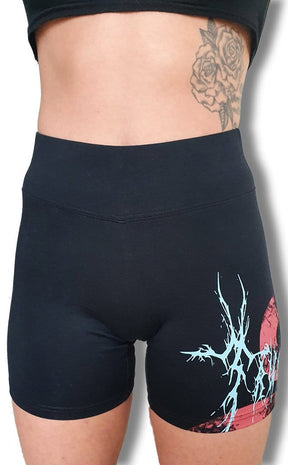 These cosy af bike shorts are high waisted and super stretchy in a design that goes with anything and everything! The left leg features a bold metal-inspired print for a pop of evil colour that'll have you looking badass on runs, walks, trips to the gym or walking the streets.