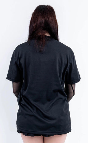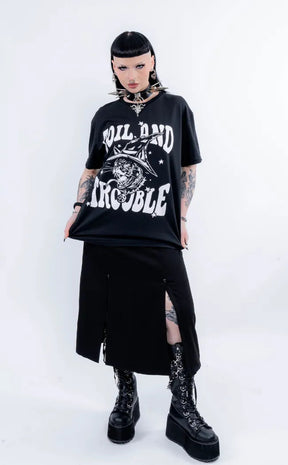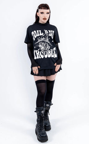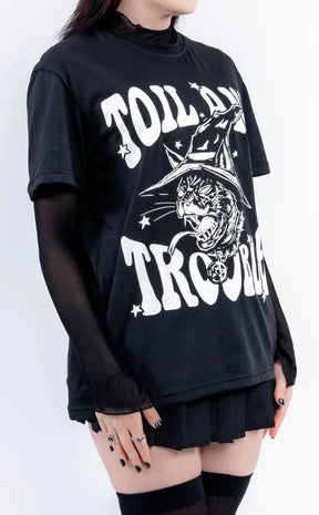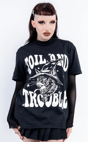 Slip into something wicked with the Toil and Trouble Oversized Tee. This tee features a black cat wearing a witch hat with the words 'Toil and Trouble'.