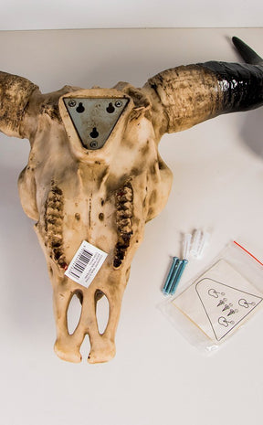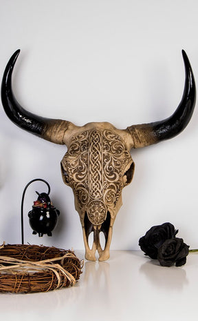 A morbid talking piece for the discerning Pagan. This unique wall plaque is modelled after a bleached cow skull, horns blackened as if it attempted to charge blindly into the darkness. Its forehead is carved with intricate filigree and Celtic knotwork, fully prepared for forbidden rites and rituals.