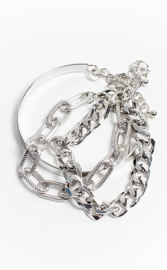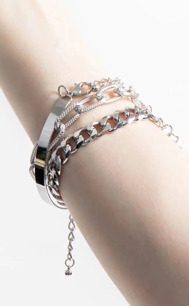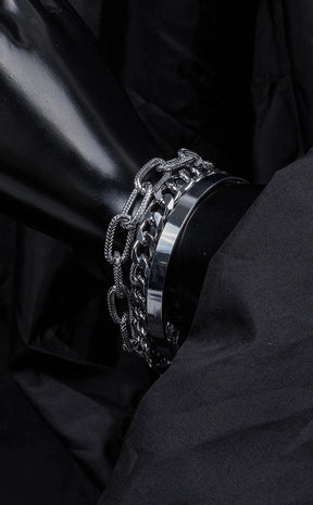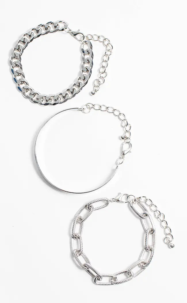 Coming in a set of three, these gorgeous bracelets pack a perfect punch of goth aesthetic to any outfit. Featuring 1 x silver bangle bracelet and 2 x silver chain bracelets.