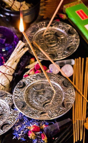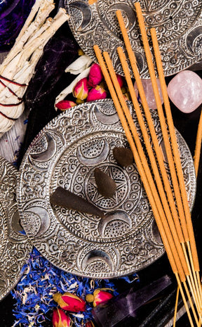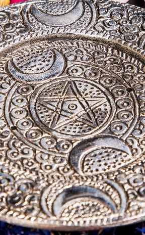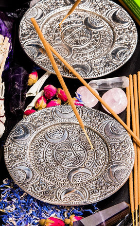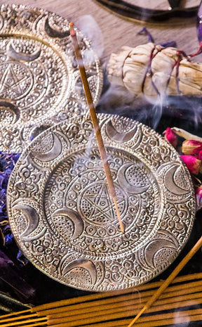Round, silver metal triple moon incense holder and burner perfect for your witches altar!
