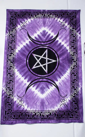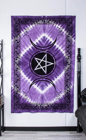 Enhance your wall decor with the Triple Moon Tapestry! This psychedelic wall hanging features a pentagram triple moon symbol bordered by Celtic knotwork. The whole piece is tie-dyed with a witchy purple, adding a unique visual texture and pop of colour.