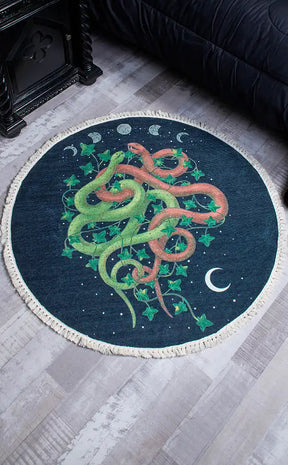 This rug features two snakes twisted together in the moonlight with a moon phase symbol above. This round rug is trimmed with a fringe, perfect for rolling out in bedrooms and loungerooms to create a relaxing, magickal atmosphere.