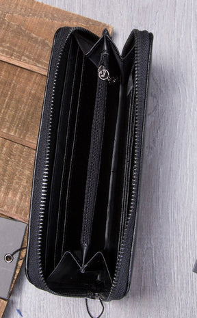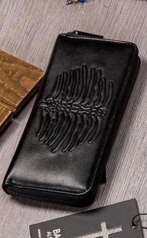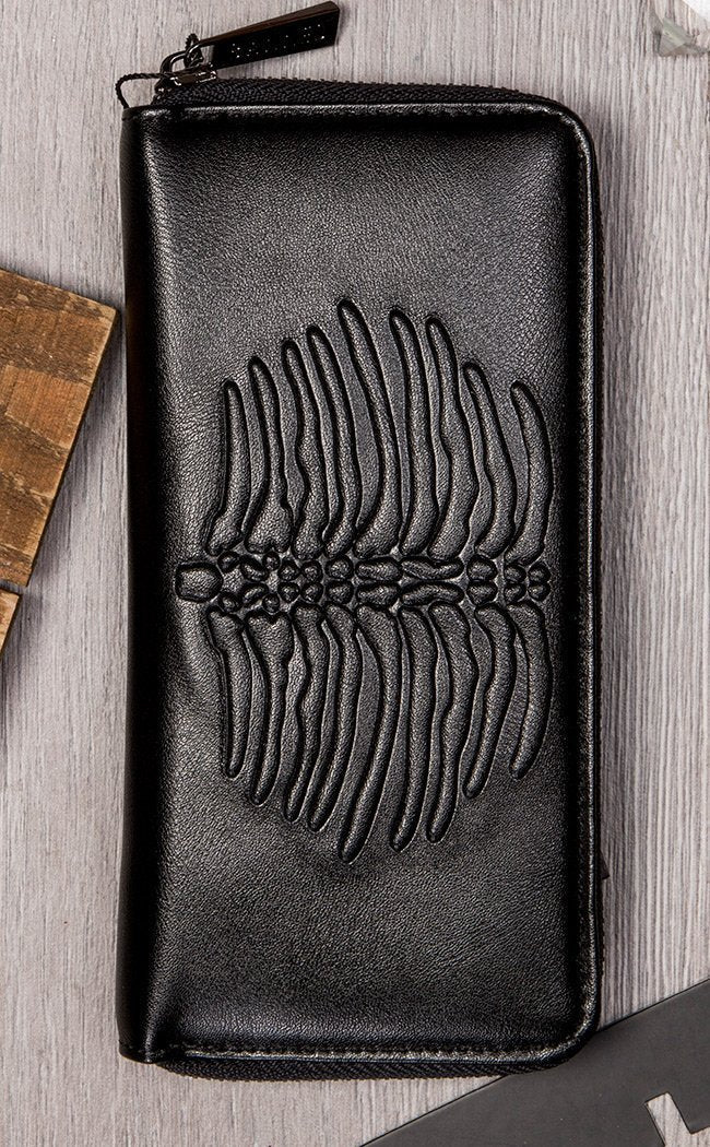 No bones about it! Keep your cash and cards together in this dealthy stylish wallet. The front is embossed with a killer set of ribs, opening with a gunmetal zip to revel plenty of card slots and a zipped pocket for change.