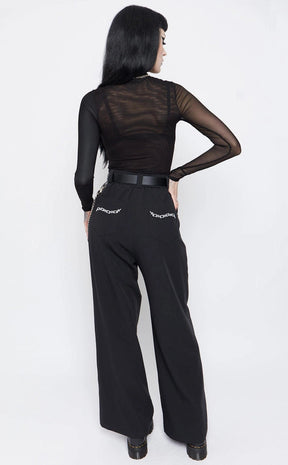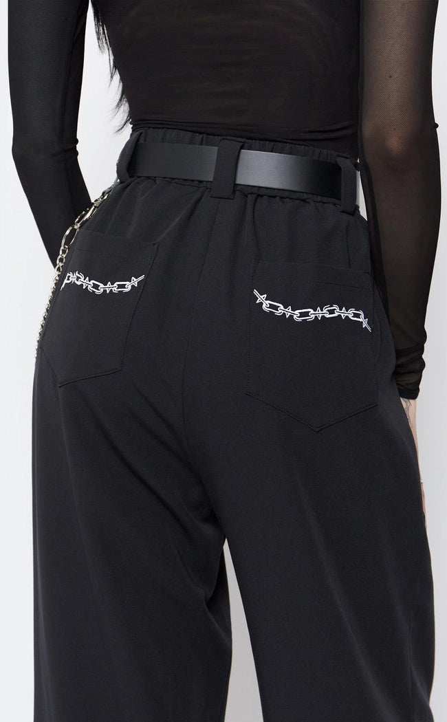 Finished with chain embroideries across both back pockets, chunky O-ring and our signature branded metalware to the front - you asked for business goth, so we delivered.