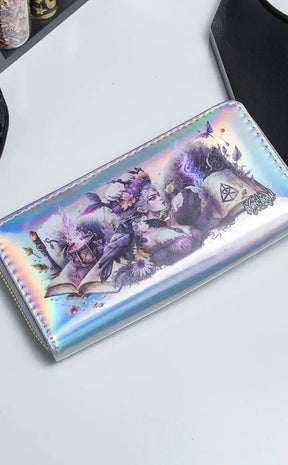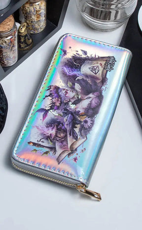 This holo silver wallet features artwork featuring a gorgeous forest witch and her familiar raven The wallet unzips to reveal a zipped coin pocket and multiple card slots.